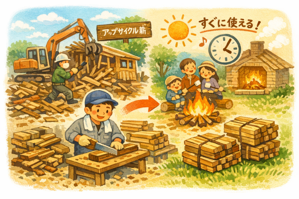 薪の宮の薪は、住宅の解体工事で出る廃材を加工した“アップサイクル薪”。